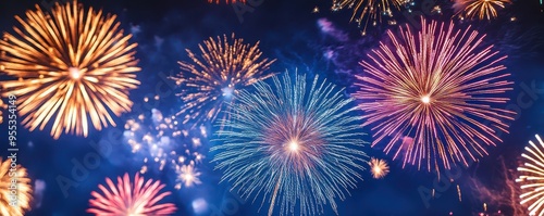 Naklejka premium Vibrant fireworks illuminate the night sky with colorful bursts, perfect for...