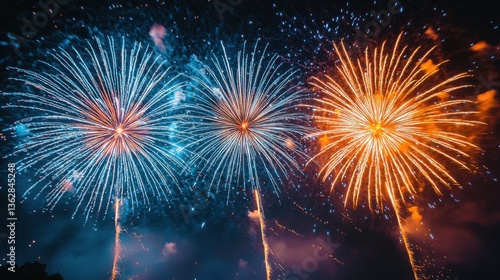 © Mohammed, Naklejka premium Vibrant fireworks light up the night sky with dazzling displays of blue, orange, and gold. A spectacular celebratory scene!