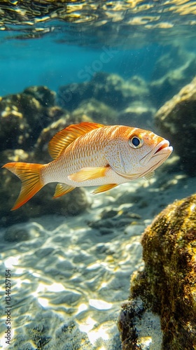 © Dotoday, Naklejka premium Vibrant fish swimming gracefully in clear blue water near rocky seabed.