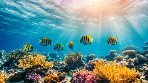 Naklejka premium Vibrant Fish Swimming Through Coral Reefs Under Natural Light