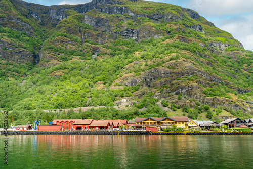 Fototapeta premium Vibrant Flam village buildings line the picturesque fjord waterfront.