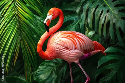 Fototapeta premium Vibrant Flamingo Standing Gracefully Among Lush Green Foliage in a Tropical Environment