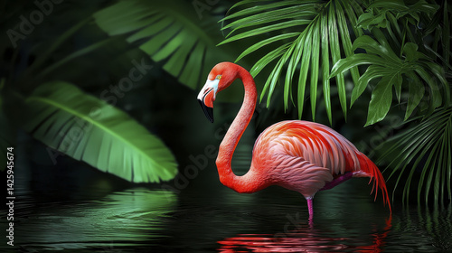© Kittayawan, Fototapeta premium vibrant flamingo wading gracefully in serene lake surrounded by lush green foliage, creating tranquil atmosphere