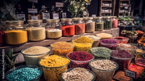 Fototapeta premium Vibrant Flavors: A Colorful Fusion of Asian Spice, Turkish Bazaar, and Wholesome Ingredients in a Market of Exotic Fruits and Healthy Dried Nuts, generative AI