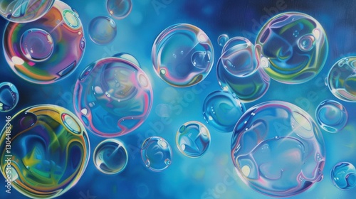 © UseeIvan, Naklejka premium Vibrant floating bubbles in blue abstract background