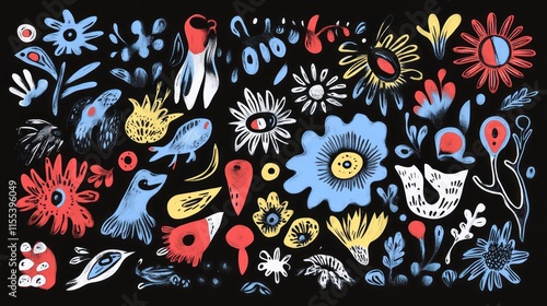 Fototapeta premium Vibrant Floral and Fauna Fantasy: A Whimsical Hand-Drawn Illustration