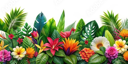 Fototapeta premium Vibrant floral arrangement featuring lush green leaves and colorful tropical flowers in a seamless background