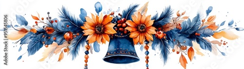 Naklejka premium Vibrant floral arrangement featuring orange sunflowers and blue accents, perfect for festive decoration and celebration themes.