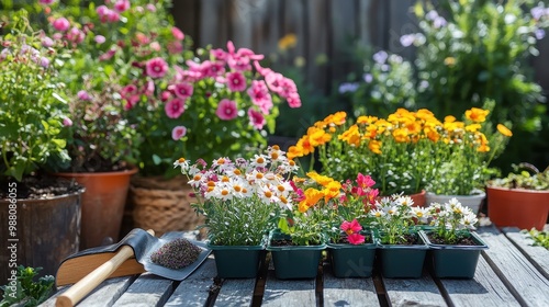 © JH45, Obraz premium Vibrant Floral Arrangement in Rustic Garden Setting
