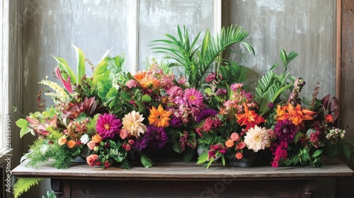 © almeera, Naklejka premium Vibrant floral arrangement on wooden table in a room with textured wall