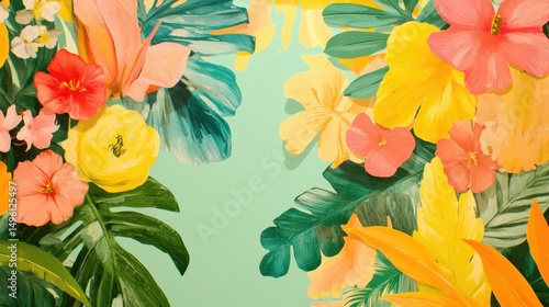 Fototapeta premium Vibrant floral arrangement with tropical leaves and colors.