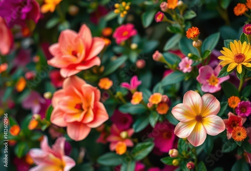 Fototapeta premium Vibrant floral backdrop, lush blooms in soft focus, detail, background
