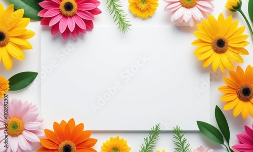 Obraz premium Vibrant floral frame with blank white card surrounded by colorful blossoms