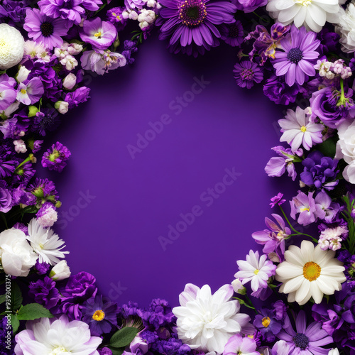 © Flowaiart, Fototapeta premium Vibrant Floral Frame with Purple, White, and Various Floral Arrangements Captivates Focus