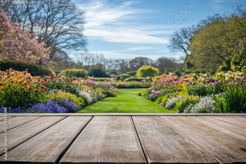 © Hamzah, Fototapeta premium Vibrant floral garden scene with wooden foreground