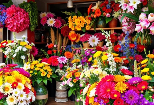 Fototapeta premium Vibrant floral shop brimming with colorful blooms, showcasing artful arrangements, shop, cheerful