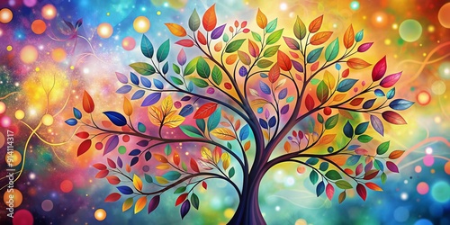 Fototapeta premium Vibrant floral tree with multicolored leaves on delicate hanging branches set...
