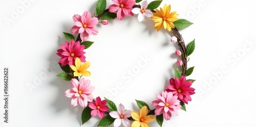 © dadtophoto, Obraz premium Vibrant floral wreath with bunny ears, round frame, egg, colorful, round