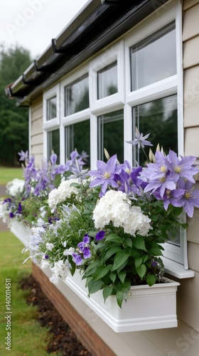 © pvl0707, Naklejka premium Vibrant flower boxes elegantly decorate the exterior of a delightful house, nestled in a peaceful garden under a bright, sunny sky