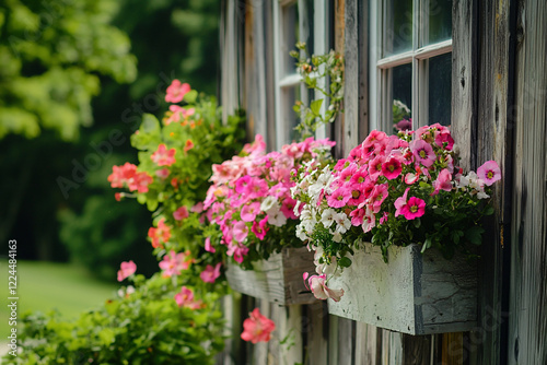 © Adi, Obraz premium Vibrant flower boxes overflowing with pink and white blooms adorn a rustic wooden cabin window outdoors