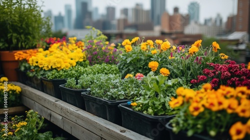 Fototapeta premium Vibrant flower display in urban rooftop garden nature cityscape view