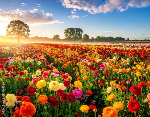© Sus, Fototapeta premium Vibrant Flower Field at Sunrise.