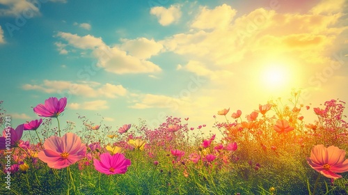 Fototapeta premium Vibrant Flower Field Under Golden Sunset Sky