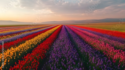 Fototapeta premium Vibrant flower fields at sunset, colorful rows of blooming flowers in various hues under a soft sky, perfect for nature themes.