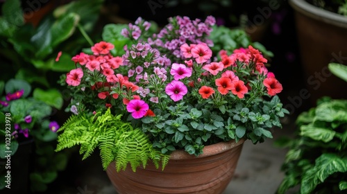 © Sampao, Obraz premium Vibrant Flower Pot with Colorful Petunias and Greenery
