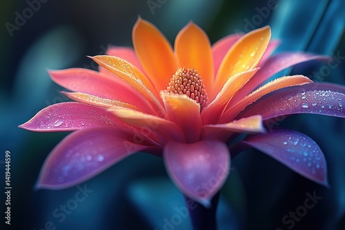 Fototapeta premium Vibrant flower with dew drops in a garden setting