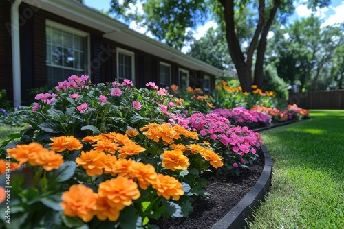 Obraz premium Vibrant flowerbeds line a home's yard