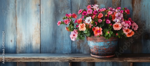 Fototapeta premium Vibrant flowerpot with colorful blooms on rustic wooden shelf adding charm to...