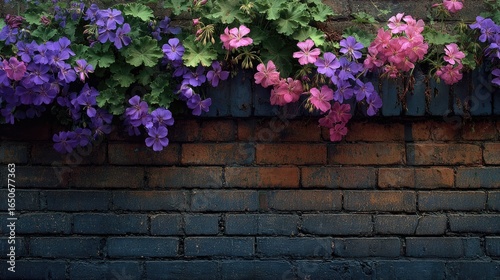 Fototapeta premium Vibrant flowers cascading over brick wall