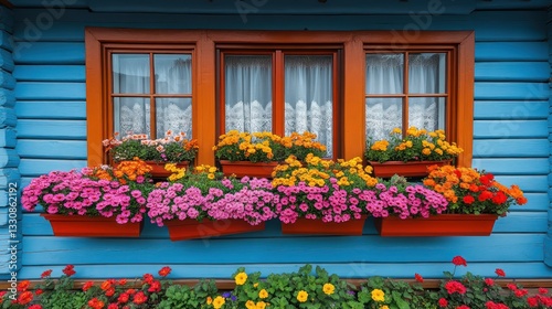 Fototapeta premium Vibrant flowers in window boxes adorn a blue wooden house