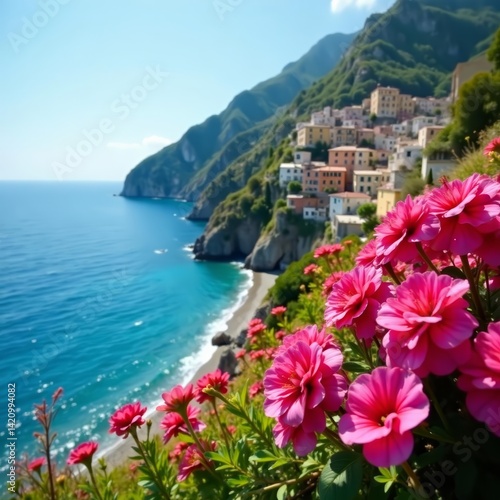 Obraz premium Vibrant flowers on coastal cliffs, Cinque Terre, scenic, coastline