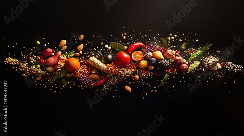 © Sabana, Naklejka premium Vibrant food explosion colorful spices nuts fruits healthy eating on transparent background dark diet