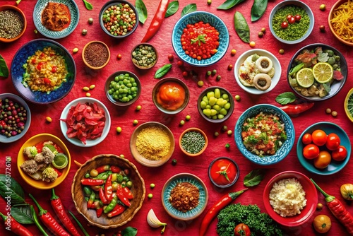 © Supittra, Fototapeta premium Vibrant Food Photography with Red Background and Arrow Motifs for Culinary Delight