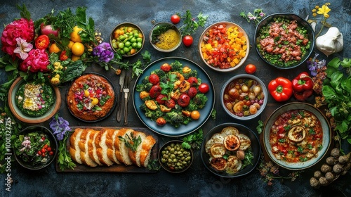 © Chananphat, Fototapeta premium Vibrant Food Platters and Potted Plants on a Circular Table.