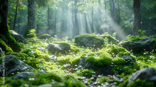© Nattawaw bbt, Fototapeta premium Vibrant Forest Scene with Sunlight and Mossy Rocks