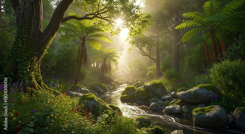 © Mst, Obraz premium Vibrant Forest Stream with Sunbeams and Moss-Covered Rocks