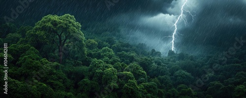 © Jiraporn, Obraz premium Vibrant forest under dramatic lightning during a stormy weather.