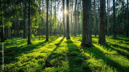Obraz premium Vibrant forest with lush grass and pine trees