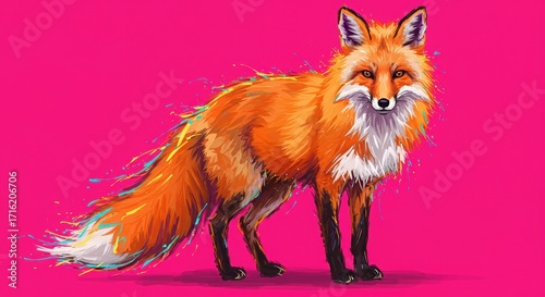 © Vicky, Obraz premium Vibrant Fox Illustration on Pink Background with Colorful Splatter Accents