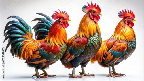 Fototapeta premium Vibrant free-range male roosters striking various poses against a white...