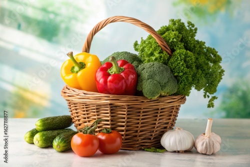 Fototapeta premium Vibrant fresh vegetables overflowing from a rustic basket, showcasing healthy...