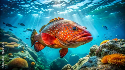 Fototapeta premium Vibrant Freshwater Grouper Swimming Gracefully in Crystal Clear Aquatic...