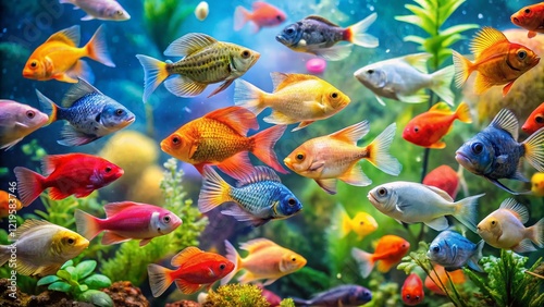 Naklejka premium Vibrant Freshwater Tropical Fish in a Lush Aquarium - High-Resolution Stock...