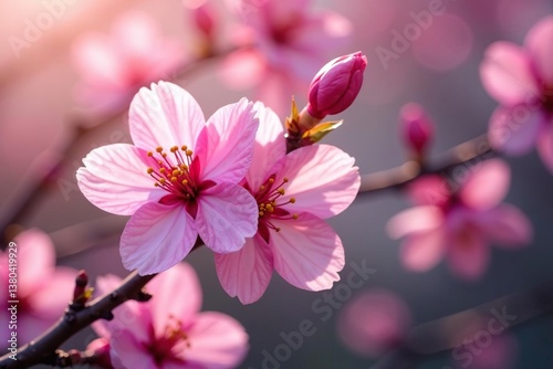 © methinee, Obraz premium Vibrant full bloom sakura, overlapping petals, lush branches , sakura branch, cherry blossom background, illustration