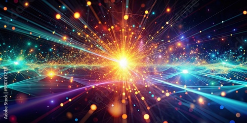 © Four888, Naklejka premium Vibrant futuristic abstract background swirling with glowing technology particles in a state of constant flux, representing the perpetual transformation of digital innovation.