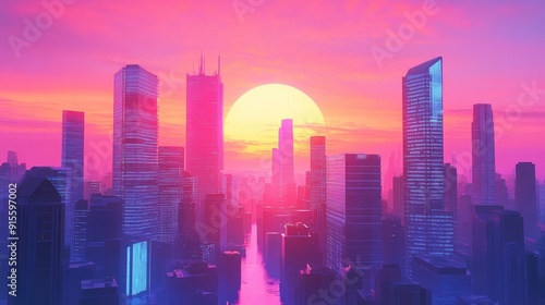 Fototapeta premium Vibrant futuristic city at sunset, colorful skyscrapers with sleek windows, modern design, dynamic illustration